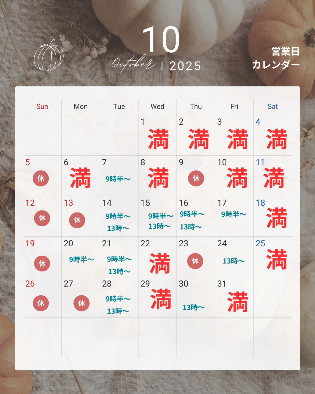 10月の空き状況について、お問い合わせを多く頂いておりますので、最新の情報をお知らせいたします。